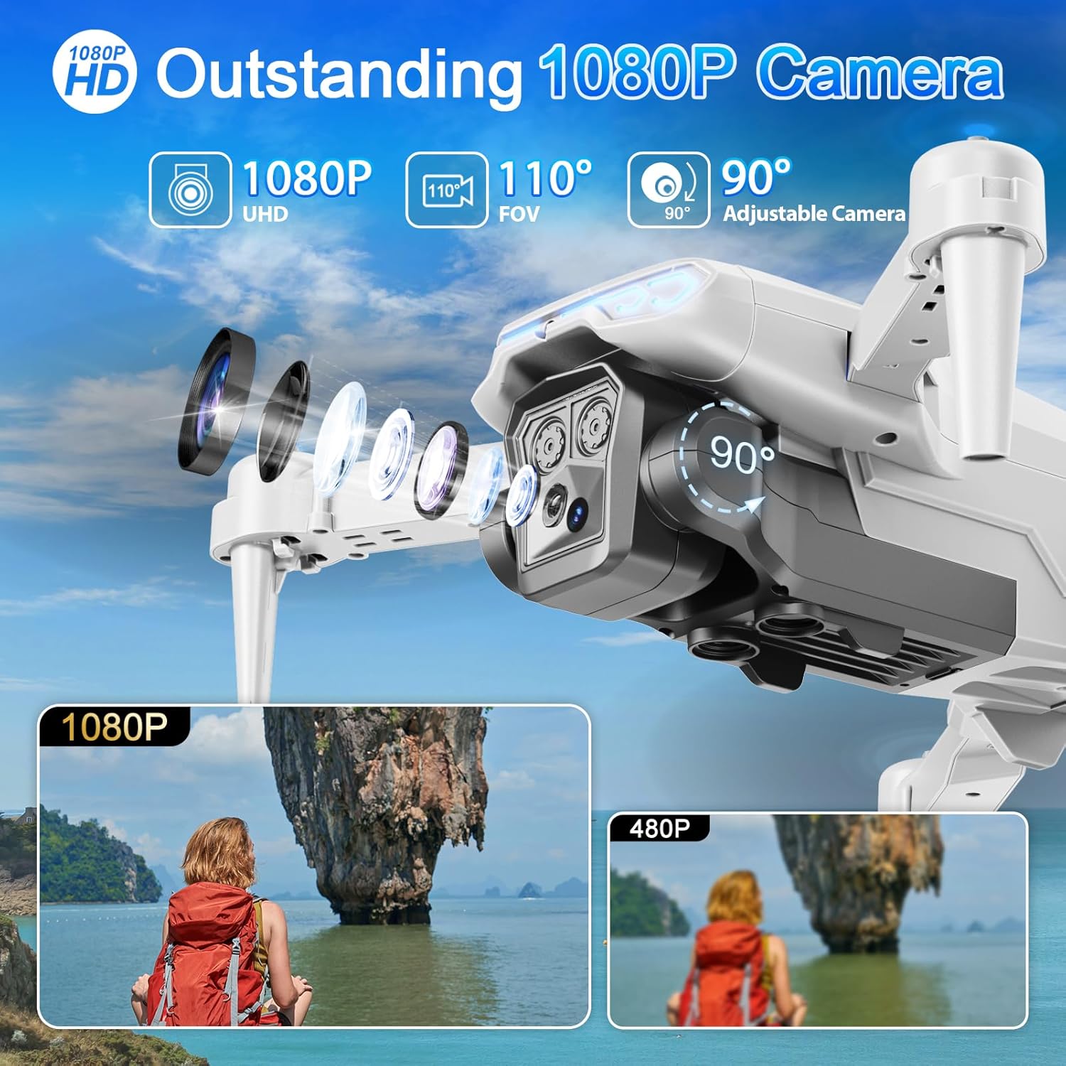 📷 Cámara HD 1080P: Lente ajustable 90° con transmisión en tiempo real FPV.