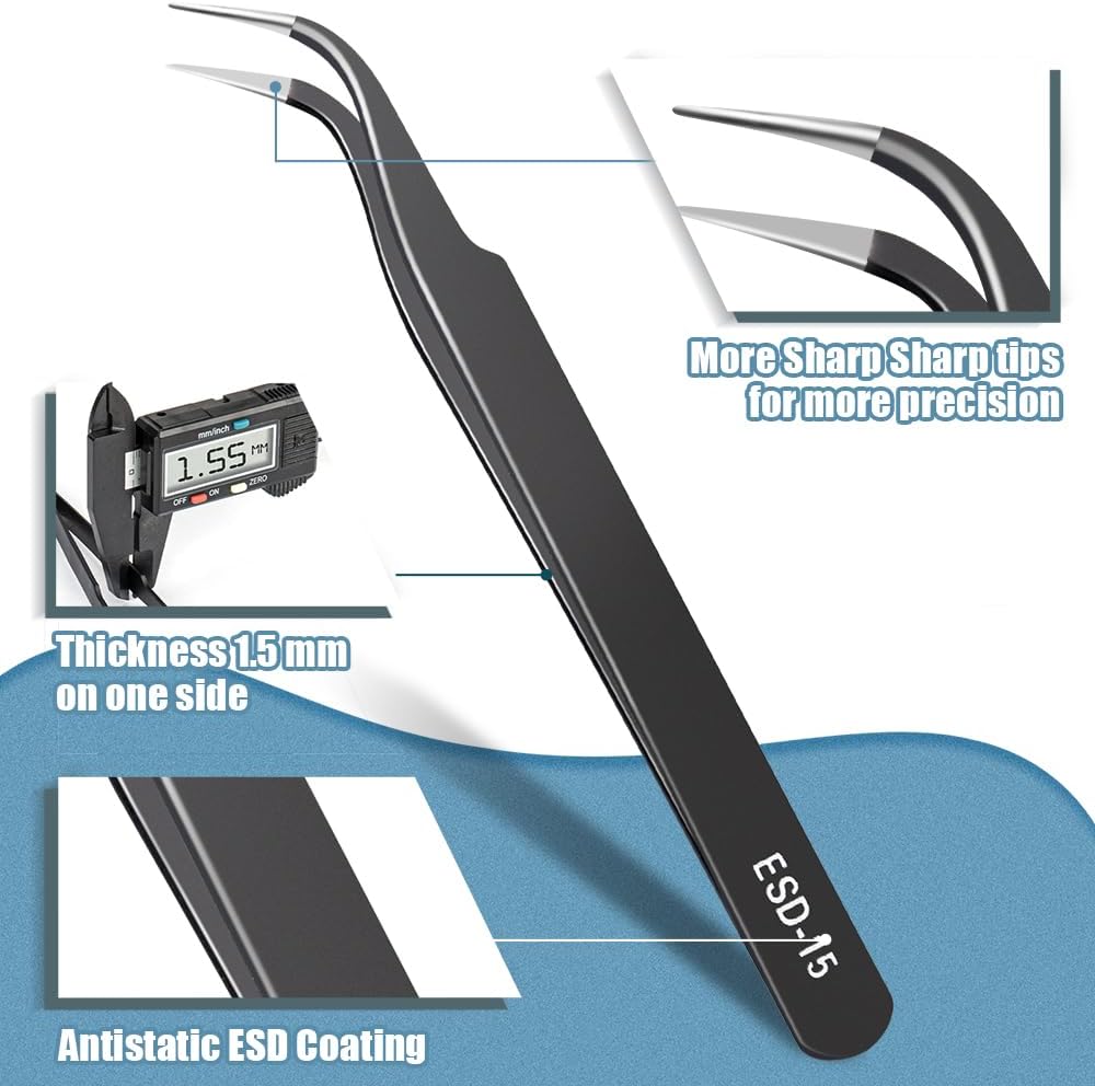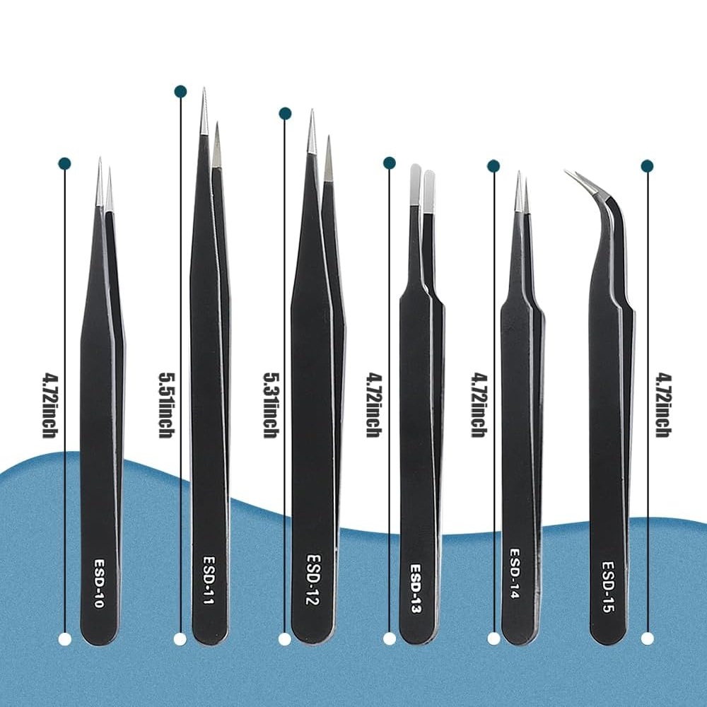 • 6 x Pinzas de precisión ESD (diferentes formas: rectas, curvas, finas)