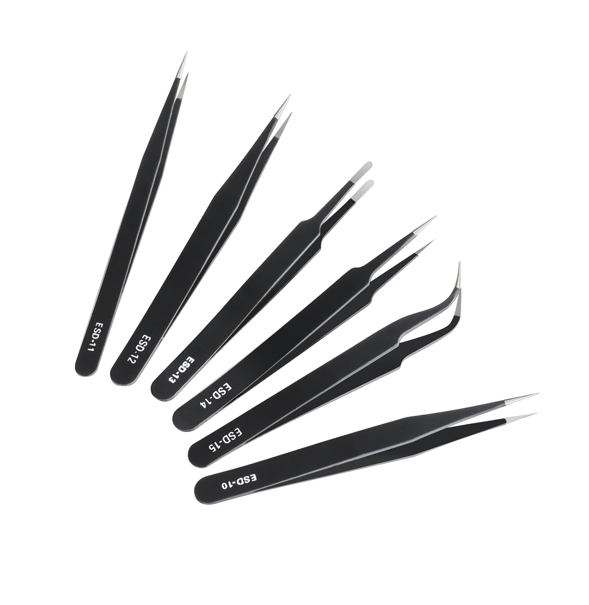 Juego de 6 Pinzas de Precisión – Acero Inoxidable Antiestático ESD | Electrónica, Manualidades y Laboratorio
