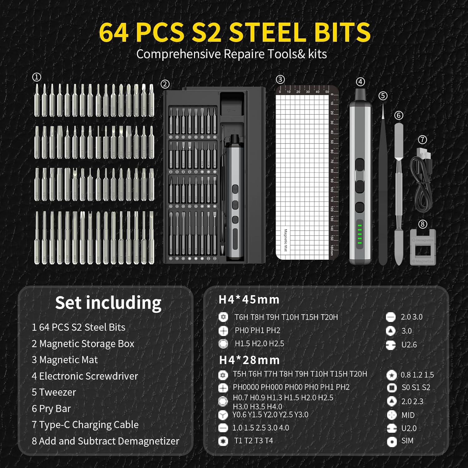 • 🪛 64 puntas de precisión: fabricadas en acero S2 endurecido, cubriendo 18 categorías para múltiples usos